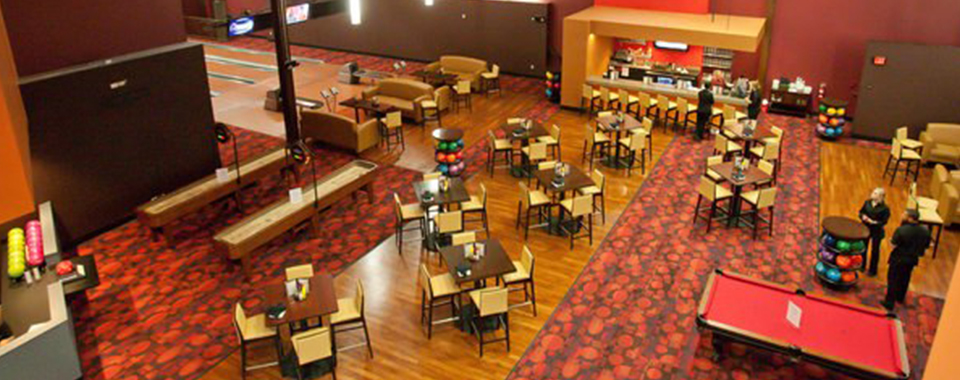 Upscale entertainment center with boutique bowling, games, sports theatre, live entertainment, bars and restaurant.